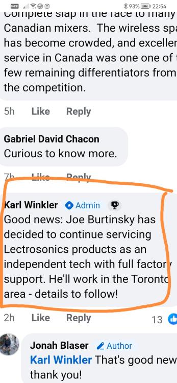 This is sad news. Joe at Lectro Canada was a talented tech and a fine chap. Similar to the late Bill Carter at Sennheiser Canada. Now with both offices gone it will be a major PITA to get items serviced. In the music gear industry they have "warranty approved" independent technicians in many countries, avoiding the hassle of shipping and returning stuff overseas and all the paperwork and fees. Hopefully Joe can offer that service here in Canada....